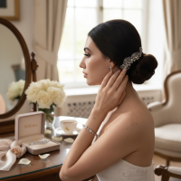 This enchanted gable spins the tale of true love. Three tropical exquisitely detailed frangipani flowers with crystal centres start and end this ethereal piece. The aura of freedom, joy and love is continued with sweet tendrils of delicate seed pearls, crystal drops and young buds all backlit by a warm rose gold finish. A truly exquisite free spirited detail for the perfect celebration of love.