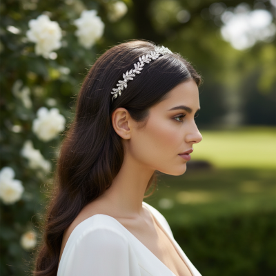 Crown yourself with the glory of this spectacular piece and catch the light on your magical day. A mesmerising wave of Marquise cut crystals and pavé set crystal motifs flow sensuously along the length of this band. A sublimely dazzling whisper of regal elegance to bring astral fire and radiance to your look.