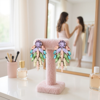 Radiate show stopping elegance with these Exquisite Earrings. *Flawless multi coloured cut crystals *Earring size is 4.2cm .These chic and stylish earrings will elevate your look with its astral fire and brilliance. The high quality crystals create an exquisite, red carpet-worthy aesthetic that will have all eyes on you. Whether you're the bride, bridesmaid, or guest, these earrings will make you feel like a star.
