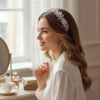 Entwine this captivating legend of crystal enchantment through your hair and let the softly shimmering beauty enhance your blissful glow. A gorgeously romantic piece rich with light ivory pearls and radiant crystal Pearl petalled leaves. A breathtaking look for your glorious day as your hearts entwine for all time. Dimensions ; Simulated ivory pearls,clear crystals and hoops at each end for styling included.