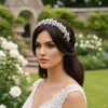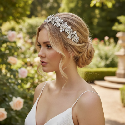 Set upon a sleek silver headband, the heavily embellished design offers a luxurious, high-impact look while maintaining elegant sophistication.