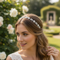 Crystal embellished hair vine in a unique design with clear crystals and simulated ivory pearls on a silver finish - complete with satin ribbon.