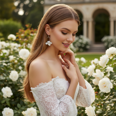 Integrate the lyrical luxury of bewitching porcelain orchids and shimmering pearl highlights, and allow the captivating femininity of exquisite blossoms suspended on a circle of gold to add just the right touch of mystique to enhance your look.