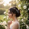 Entwine this captivating legend of pearl enchantment through your hair and let the softly shimmering beauty enhance your blissful glow. A gorgeously romantic piece rich with light ivory pearls and radiant Pearl petalled flowers. A breathtaking look for your glorious day as your hearts entwine for all time. The intensely set floral work is offset beautifully by a light ivory ribbon. Dimensions ; Simulated Ivory pearls, Ivory satin ribbon for styling included. Vine is approx-35cm long gold finish