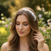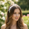 Lightweight and delicately crafted, this dainty pearl headband is beautifully embellished with simulated ivory pearls, pearlised daisy flowers, and refined silver leaf detailing. Set on a polished silver-finish headband, its understated design offers effortless elegance—perfect for brides and bridesmaids who favour a more simple, timeless aesthetic. Details: Lightweight design for comfortable wear Embellished with simulated ivory pearls and pearlised daisy flowers Silver leaf detailing Polished silver-finish headband Ideal for brides and bridesmaids seeking a simple, elegant style
