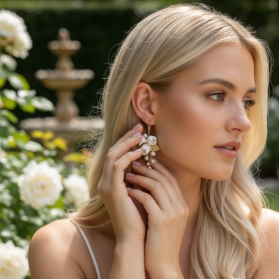 Vintage inspired earrings - Decadent clay flowers and freshwater pearls with silver vine leaves will enchant onlookers and bring an ethereal aura to your magical day. Details; High quality clay rose flowers, freshwater pearls. High shine silver finish. Dimensions;