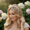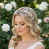 Evoke spellbinding beauty with the ethereal femininity of this breathtaking floral headband. Richly adorned with delicate crystal embellished flowers, shimmering gold leaves, lustrous crystal beads, and sparkling high-quality crystals, this intricate design captures the magic of a fairytale wedding. Graceful crystal drops add movement and light, creating a truly enchanting bridal statement. Finished on a gold-tone headband, this exquisite piece is designed to celebrate romance, elegance, and timeless beauty—perfect for brides seeking a magical finishing touch.