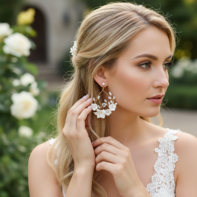 Bring magic to your look with this enchanting clay flower beauty. Delicate frangipani blooms hold court surrounded by cascading Marquise cut crystal leaves and seed pearls. The perfect romantic flourish for your perfect day. Details; * High Quality gold plated finish • clay flowers. • High quality opal crystals. • fresh water pearls. • Hand wired onto a gold finish and flexible for styling. • Dimensions