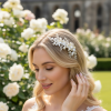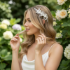 Bring magic to your look with this enchanting porcelain flower beauty. Delicate frangipani blooms hold court surrounded by cascading Marquise cut crystal leaves and seed pearls. The perfect romantic flourish for your perfect day. Details; * High Quality gold plated finish • Hand painted porcelain Blush pink flowers. • High quality crystals. • Simulated pearls. • Hand wired and flexible for styling. • Dimensions 16cm x 6cm. Fitted with a crocodile clip