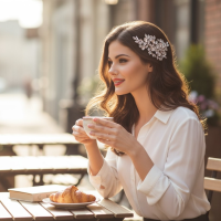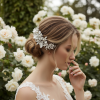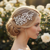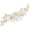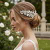 Bring enchantment to your day with this alluring flourish. A bed of delicate clear crystals and shimmering beads are cocooned by a cloud of silver hand painted leaves and freshwater pearls. An intricate finish to bring harmony and sweetness to your look. Details; High quality crystals. Hand painted silver leaves, freshwater pearls.Dimensions 18cm x 6.5cm