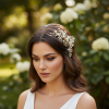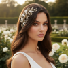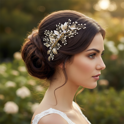 Exquisite freshwater pearl comb - embellished with gleaming opal crystals and hand painted gold leaves hand wired onto a gold comb. Details: Freshwater pearls, hand painted leaves, opal crystals, flexible design. Size is 14cm x 7cm high.
