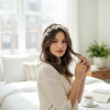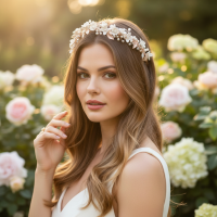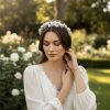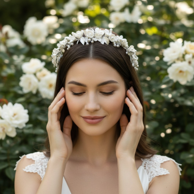 Bring enchantment to your day with this alluring flourish. A bed of delicate clay flowers are embellished with simulated ivory pearls and cocooned by a cloud of vintage style leaves . An intricate finish to bring harmony and sweetness to your look. Details; High quality simulated pearls, ivory clay flowers, vintage metallic leaves. High shine silver finish.