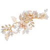 Bring enchantment to your day with this alluring headpiece. Embellished with pink blush flowers cocooned amongst a lush variety of crystal embellished flowers, simulated pearls and crystals. An intricate finish to bring harmony and sweetness to your look. Details; High quality crystals. hand painted pink blush flowers, simulated ivory pearls and clear crystal beads. High shine gold finish. Dimensions : 19cm x 7.5cm wide. Fitted with a crocodile clip at the back.