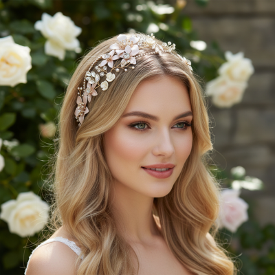 Bring the lyricism of fantasy to your day; an enchanting interplay of pink blush frangipani flowers and blossoms wind a story of magic and radiance through your hair, accented by Marquise cut crystals, glowing pearls and crystal twine. Spellbinding, ethereal and romantic.