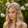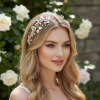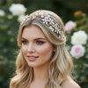 Bring the lyricism of fantasy to your day; an enchanting interplay of pink blush frangipani flowers and blossoms wind a story of magic and radiance through your hair, accented by Marquise cut crystals, glowing pearls and crystal twine. Spellbinding, ethereal and romantic. Details; High quality crystal. High shine gold finish. Simulated pearls. Flexible vine with ivory satin ribbon for styling. Dimensions 30cm x 5cm at widest point.