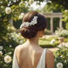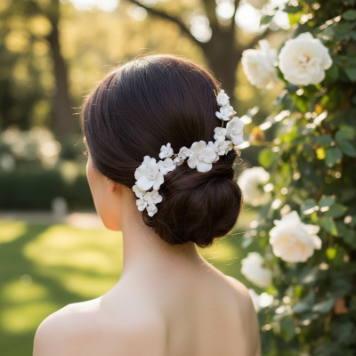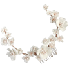This is truly an intricate and highly detailed piece, perfectly balanced by clever use of clusters of clay flowers and seeded pearls. This exquisite headpiece will be sure to elevate your look from the mundane to the simply magical. Details; High quality clay flowers and simulated ivory pearls . Flexible headpiece with a gold finish comb.