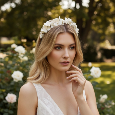Allure bridal headband. Bring enchantment to your day with this alluring flourish. A bed of delicate ivory clay flowers are centred with fresh water pearls on a gold finish headband. An intricate finish to bring harmony and sweetness to your look. Details; High quality ivory clay flowers, freshwater pearls.