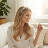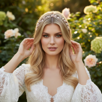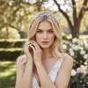 Evoke spellbinding beauty with the ethereal femininity of this breathtaking vine. Rich with delicate hand painted leaves, simulated pearls and sparkling crystals, this intricate piece is sure to delight. Delicate crystal drops and hand painted silver flowers evoke the beauty of a fairytale wedding, Embrace the magic of your story with this enchanting headpiece, fit for a princess on her special day. Details; High quality crystals. Hand painted silver leaves. Simulated pearls. Complete with ivory satin ribbon. Dimensions, 32cm.