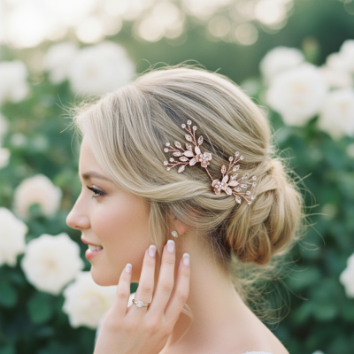 Floral romance hair pins - stunning floral design hand wired with clear crystals on a hand painted rose gold finish. Size is approx 8cm x 1cm wide
