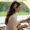 Bring enchantment to your day with this alluring flourish. A bed of delicate hand painted flowers are cocooned by a cloud of gold metallic leaves, clear cut crystals crystal beads and simulated ivory pearls on a gold finish comb. An intricate finish to bring harmony and sweetness to your look. Size is approx 7cm