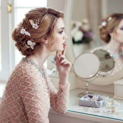 Like magical fairy dust, sprinkle these enchanting confections through your hair. Delicate blush pink roses bloom to reveal crystal dappled centres. These sweet pieces are perfectly enhanced with sprigs of crystal drops, shimmering seed pearls and a variation of gold, satin, hand painted and pavé set filigree leaves. The perfect finishing touches bringing kisses of gilded warmth, opulent romance and radiant sparkle to your fairy tale come true.
