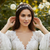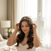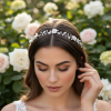 Bring a kiss of radiance to your day of wonder with this enchanting vine. Embellished with clay flowers, marquise cut crystals and seeded pearls on a pale gold vine, complete with a flawless ivory satin ribbon for perfect styling.