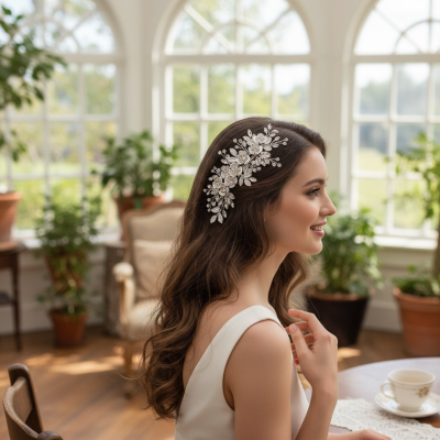 Lush enchantment hair vine. Bring enchantment to your day with this alluring flourish. Delicate hand painted silver flowers are cocooned amongst a lush variety of silver leaves and clear marquise crystals. An intricate finish to bring harmony and sweetness to your look. Details; High quality crystals. silver flowers, marquise crystals . High shine silver finish. Light ivory ribbon included, wear with or without ribbon.
