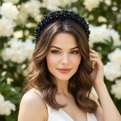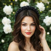 Luxe Alice band - embellished with various sizes of simulated Black pearls on a padded black band.