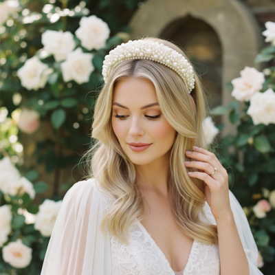 Luxe Alice band - embellished with various sizes of simulated ivory pearls on a padded band.