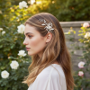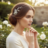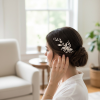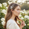 Pretty chic headpiece - embellished with simulated ivory pearls and silver hand leaves with brilliant marquise clear glass crystals. Complete with crocodile clip at the back for an easy fit. Size is 13cm long