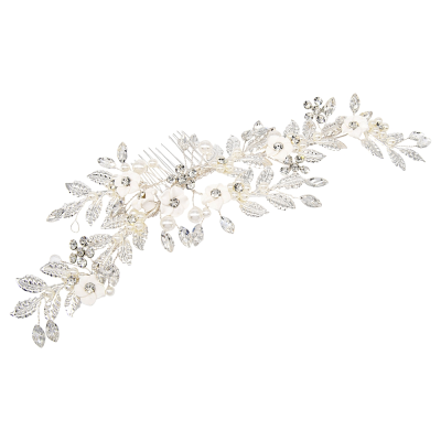 Bring enchantment to your day with this alluring flourish. A bed of delicate clay flowers are cocooned amongst a lush variety of crystal embellished flowers, simulated pearls and crystals. An intricate finish to bring harmony and sweetness to your look. Details; High quality crystals. clay flowers, simulated ivory pearls. High shine silver finish. Dimensions : 28cm x 9cm wide.