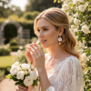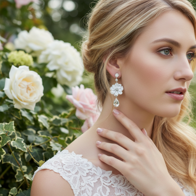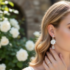 Evoke the golden age of romanticism and create an Austen worthy look with the iridescent luminosity of these chandelier blooms. Shimmering ivory petals suspend a delicate pure pear cut crystal; the sumptuous design completed by a halo of champagne brilliant cut crystals and an ethereal crystal droplet. A captivatingly feminine flourish to enrich your special day attire.