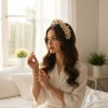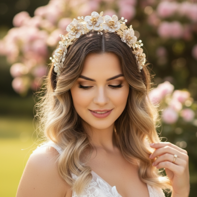 Elevate your accessory collection with our exquisite blush pink headband, a stunning statement piece that features hand-painted blush pink flowers and crystal-embellished leaves. The double row gold headband adds a touch of elegance, while the clear crystal beads provide a sparkling finish. Measuring 20cm x 5cm, this headband is perfect for special occasions or adding a touch of glamour to your everyday look. Make a lasting impression with this beautifully crafted accessory that combines artistry and sophistication.