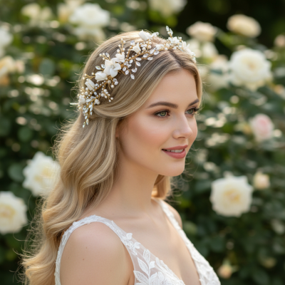 Bring magic to your look with this enchanting porcelain flower beauty. Delicate frangipani blooms hold court surrounded by cascading Marquise cut crystal leaves and freshwater pearls. The perfect romantic flourish for your perfect day.