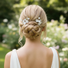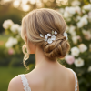 Entwine these captivating hair pins through your hair and let the softly shimmering beauty enhance your blissful glow. A gorgeously romantic set of hair pins each piece rich with clear beads, soft hand painted silver leaves and radiant petalled flowers. A breathtaking look for your glorious day as your hearts entwine for all time. Details, clear beads, ivory petalled flowers, hand painted silver leaves on a silver pin. Size of pins is approx 7cm long