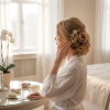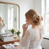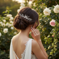 Let the sumptuous silver of this gleaming piece crown your beautiful day. Decadent silver vine leaves are highlighted by Marquise brilliant cut opal crystals and shimmering simulated ivory pearls will enchant onlookers and bring an ethereal aura to your magical day. Details; High quality clay rose flowers, simulated ivory pearls. High shine silver finish. Dimensions; 10.5cm x 5cm