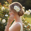 Capture the timeless romance and enigmatic beauty of the rose with this exquisite creation. Two delicate ethereal fabric roses sit side by side on a bed of sublimely embroidered lace leaves and Marquise crystal sprays. An evocative piece to honour your sacred union on your magical day.