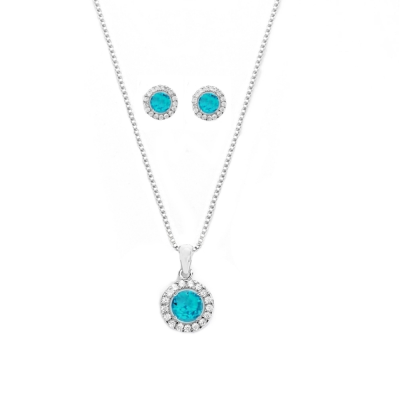 Evoke the romance of sparkling tropical turquoise waters and the paradise of azure skies with these breathtaking beauties. A brilliant cut intense aqua solitaire surrounded by a halo of iridescent crystals captures the light at all angles. Be inspired by idyllic island getaways and bring the magical radiance of these bewitching pieces to the warm waters of your day of love. Perfect for a destination wedding. Details; High shine silver-plated finish. High quality cubic zirconia crystals. Dimensions, adjustable chain 16-18cm. Pendant 1cm x 1cm. Earrings 1cm x 1cm.