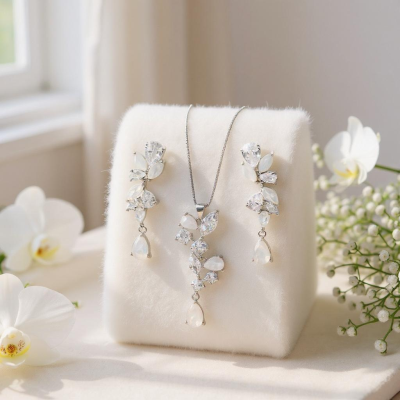 The Couture opal shimmer necklace set is the epitome of elegance and sophistication. This stunning set includes a necklace and matching earrings, both adorned with clear pear cut cubic zirconia crystals and opal crystals. The shimmering opal crystals add a touch of mystical beauty to the already dazzling design. The necklace and earrings are crafted with a silver finish, giving them a timeless and classic look. The necklace is 4.5cm long and 2.5cm wide, making it the perfect statement piece for any neckline. The delicate yet intricate design of this set makes it a must-have for any special occasion or formal event. Whether you're attending a wedding, gala, or simply want to add a touch of glamour to your everyday look, this Couture necklace set is sure to turn heads. The combination of opal and clear cubic zirconia crystals creates a mesmerizing sparkle that will catch the light and draw attention to your neckline.
