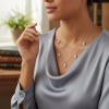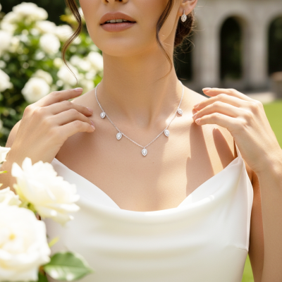 Exquisite cubic zirconia necklace - inspired by vintage - embellished with tear drop crystals on a silver tone necklace. Dimensions of each crystal tear drop is 1cm x 0.8cm and chain is 40cm long with a 5cm extender chain.