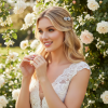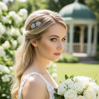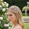 Crystal extravagance hair clip - embellished with clear cut cubic zirconia crystals with a sapphire blue crystal at the centre and plated in white gold. Dimensions are 6.2cm x 2cm