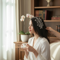 This enchanting adornment will draw admiration on your special day. A truly beautiful rendition of crystal blossoms and striking Marquise cut leaves brings intricate beauty and radiance to your look. The ethereal silver setting adds to the impression of moonlit magic and wonder. An elegantly radiant delight offering a symphony of sparkle. Details; High quality cubic zirconia crystals. High shine silver finish. Approx 16cm long and fitted with a crocodile clip.