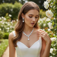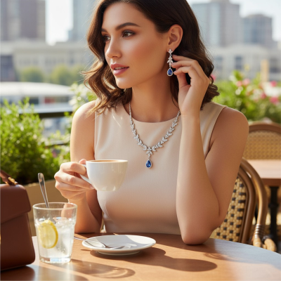 Crystal shimmer necklace set complete with matching earrings - in a chic and stylish design - with high quality pear drop sapphire cubic zirconia crystals on a sparkly silver finish. Pendant size is 1.5cm long, necklace is 41cm in length. Earrings are 4.7cm long.