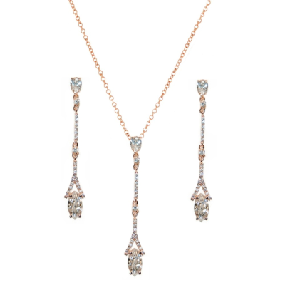 Dainty cz chandelier style necklace set with high quality clear cz crystals on a rose gold plated finish. Pendant size is 5cm long and earring size is 5cm