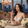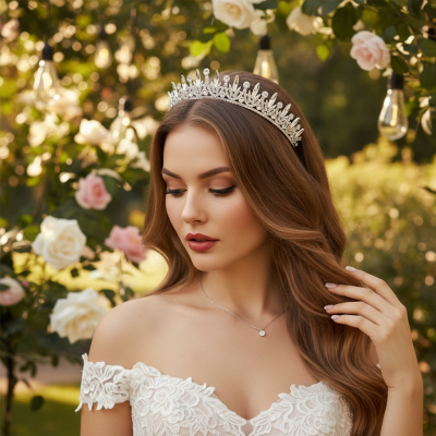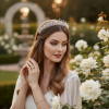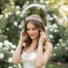 The exquisite delicacy of this luminous coronet evokes the legendary beauties of the golden age of Hollywood. The perfect symmetry of this masterpiece allows the exemplary crystal work to steal the show; from a bed of intensely set brilliant cut crystals delicate pavé set crescents rise, leading to an apex of slender pear cut crystals. The flawless stonework radiates and catches the light at every angle ensuring that you bewitch and bedazzle on your magical day.