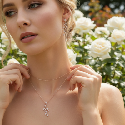 Delicate and refined, this dainty vine necklace set is exquisite in design and effortlessly stylish. Inspired by graceful botanical elements, the elegant vine motif is beautifully embellished with sparkling cubic zirconia crystals that shimmer with every movement. Crafted on a luxurious rose gold finish, the set includes small vine-effect earrings and a perfectly coordinated matching necklace. Both the pendant and earrings measure approximately 3 cm in length, offering a balanced silhouette that is eye-catching yet delicately feminine. The necklace features an adjustable chain, ensuring a comfortable and customizable fit. Perfect for brides, bridesmaids, or special occasions, this stunning vine set adds a touch of romantic elegance and timeless charm to any look.