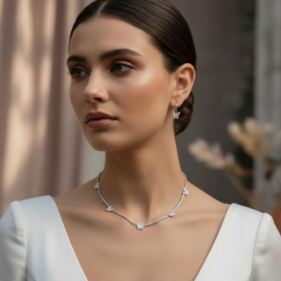 This exquisite and stylish crystal butterfly necklace set is a beautiful symbol of elegance and charm. Featuring a delicately crafted butterfly design, the set is embellished with sparkling clear cubic zirconia crystals that add radiant brilliance against a polished silver finish.
