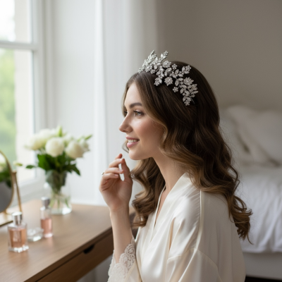 Create a breathtaking look for your magical day with the intense glory of this piece. A dazzling depiction of flawless crystal-worked radiant blooms will bring fiery unapologetic glamour to your look. A symphony of Marquise cut tropical flowers hold court on a bough of crystal forget-me-nots and Marquise cut crystal leaves. Like a treasure snatched straight from the roaring twenties, allow this intense resplendent piece to reincarnate you as a goddess of the golden age. Details; High quality cubic zirconia crystals. High shine silver finish. Fitted with hoops at each end for styling. Dimensions 29cm x 5.5cm