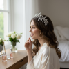 Create a breathtaking look for your magical day with the intense glory of this piece. A dazzling depiction of flawless crystal-worked radiant blooms will bring fiery unapologetic glamour to your look. A symphony of Marquise cut tropical flowers hold court on a bough of crystal forget-me-nots and Marquise cut crystal leaves. Like a treasure snatched straight from the roaring twenties, allow this intense resplendent piece to reincarnate you as a goddess of the golden age.