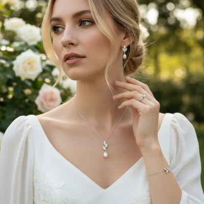 Sparkle pearl necklace set - complete with matching earrings in a unique vine effect- embellished with clear cut cubic zirconia crystals and a freshwater pearls. Plated in 18k white gold. Dimensions of earrings 3cm long with a natural pearl size of 7mm. Necklace has an adjustable chain and pearl size is 1cm.